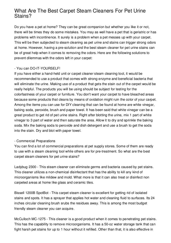 In pet urine and feces which simple cleaning can not accommodate. Interestingly, unless the pet has a bladder infection, urine is actually sterile. rolling back the carpet, steam cleaning it front and back, removal and replacement of the padding, enzyme ... Fetch This Document